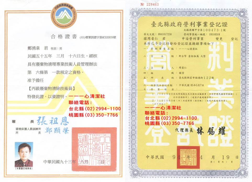 一一一心清潔社專營台北縣市.桃園縣市.基隆各鄉鎮.如你有馬桶不通.水管不通.抽水肥.抽污泥.抽污水廢水.清洗水塔.環境消毒.抽流動廁所.清水溝.大小管路包通服務.不通免費.服務親切.熱心.負責.備有丙級清除許可證書.公司設立經政府許可.一通電話服務到家.台北縣市服務電話02 29941100 02 22067777 02 26038833 02 22968877 桃園縣市服務電話03 3507766 03 3658833 快速服務專線0955900228 一一一心大三通的專家.不通免費.歡迎來電洽詢~